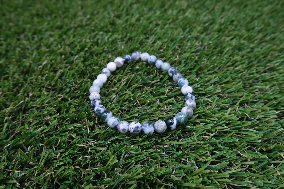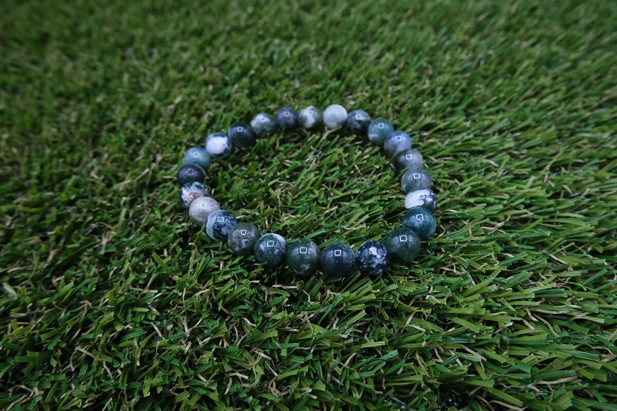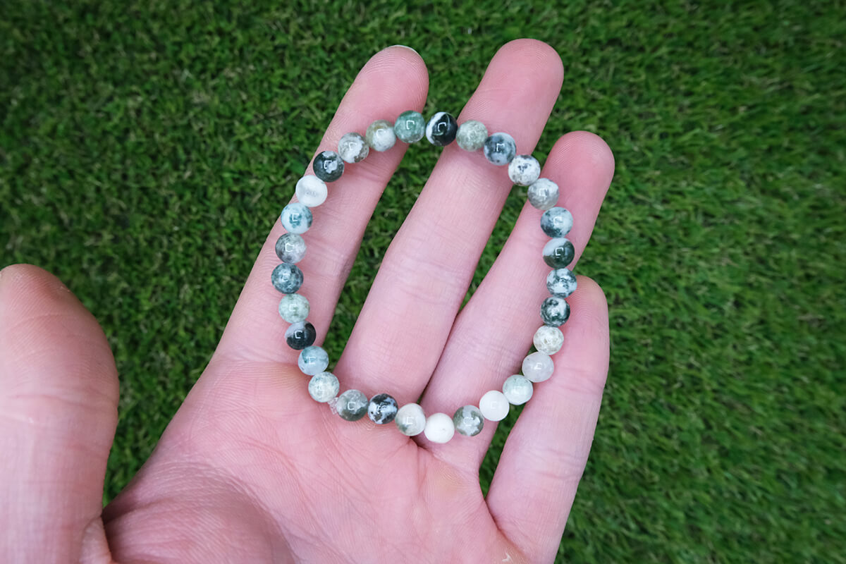 Náramek z Achátu navlečený na pružné, transparentní gumičce.