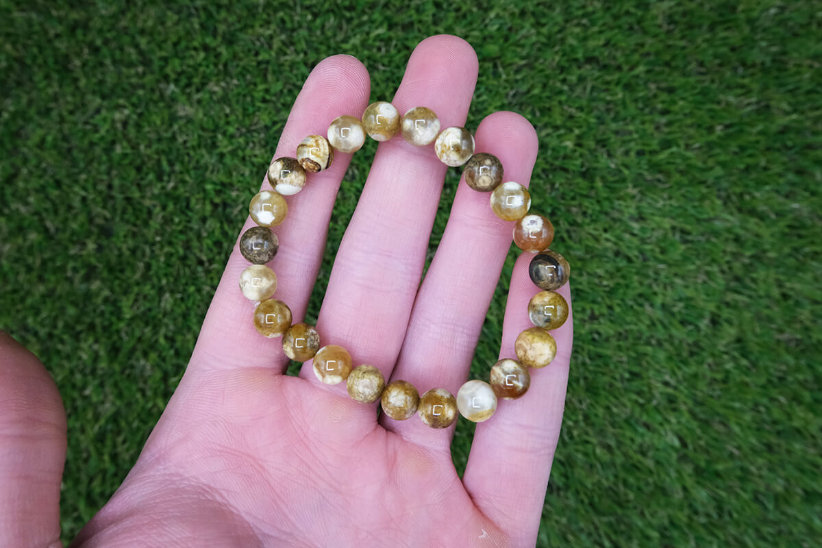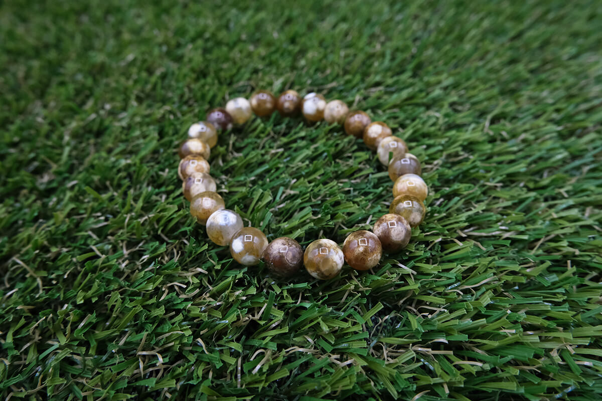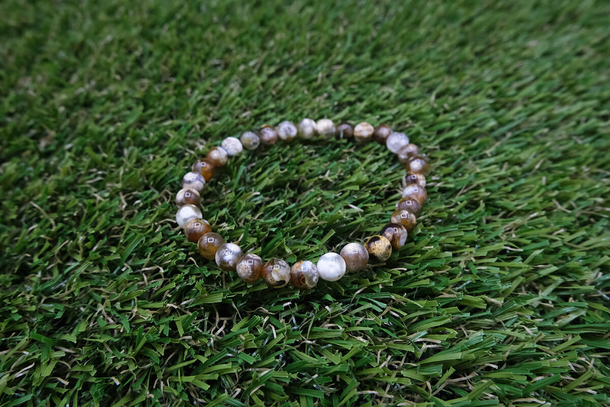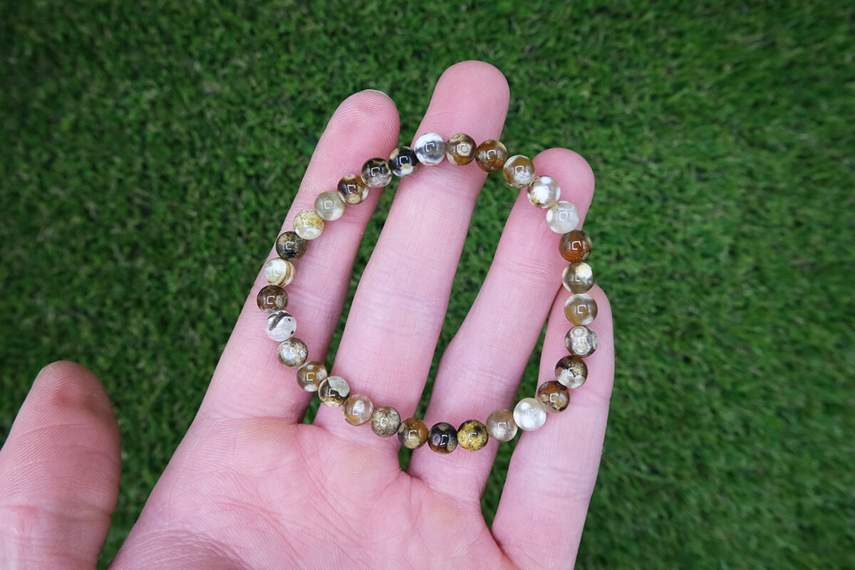 Náramek z Achátu navlečený na pružné, transparentní gumičce.
