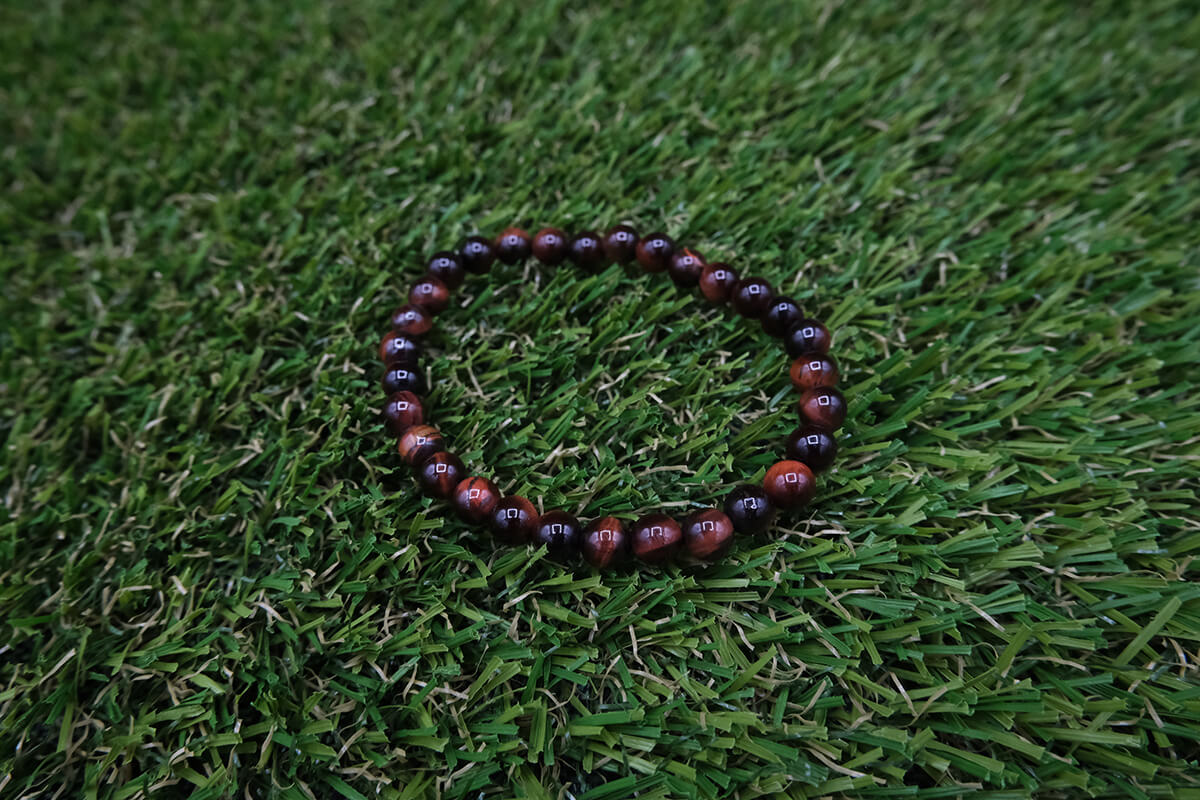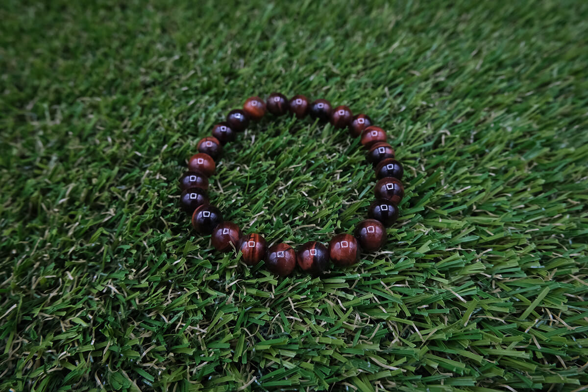 Náramek z bíčího oka navlečený na pružné, transparentní gumičce.