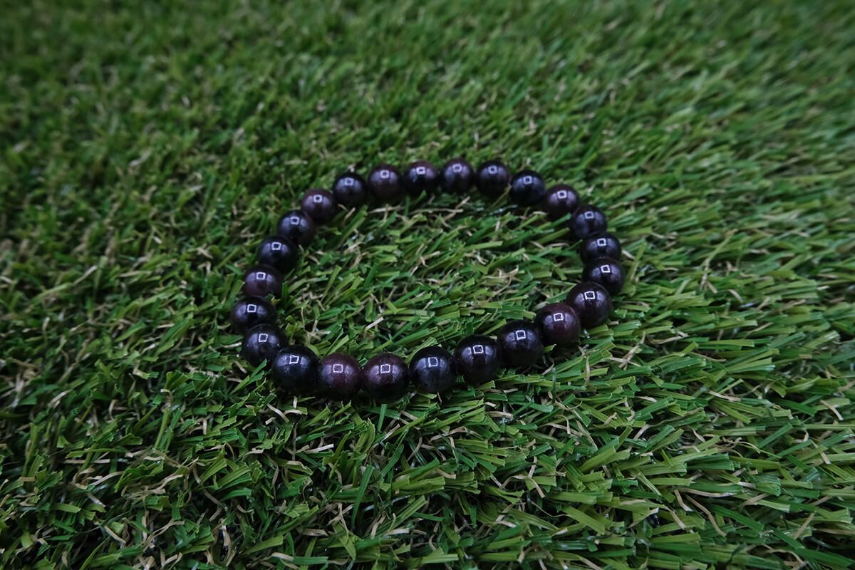 Náramek je kombinací granátu adraditu (černý) a granátu almandinu (vínový).
