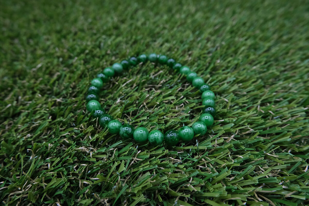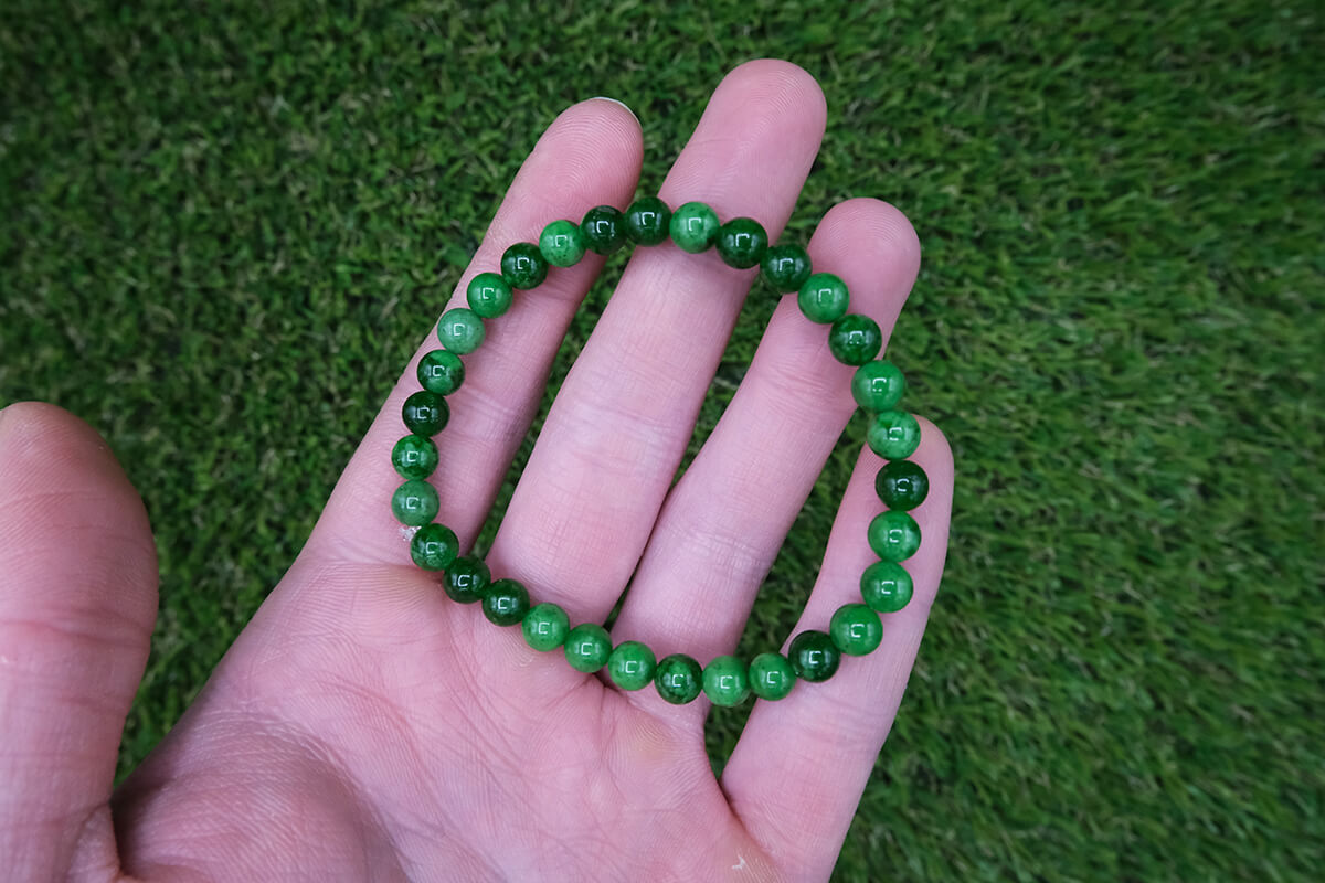 Náramek z Jadeitu navlečený na pružné, transparentní gumičce.