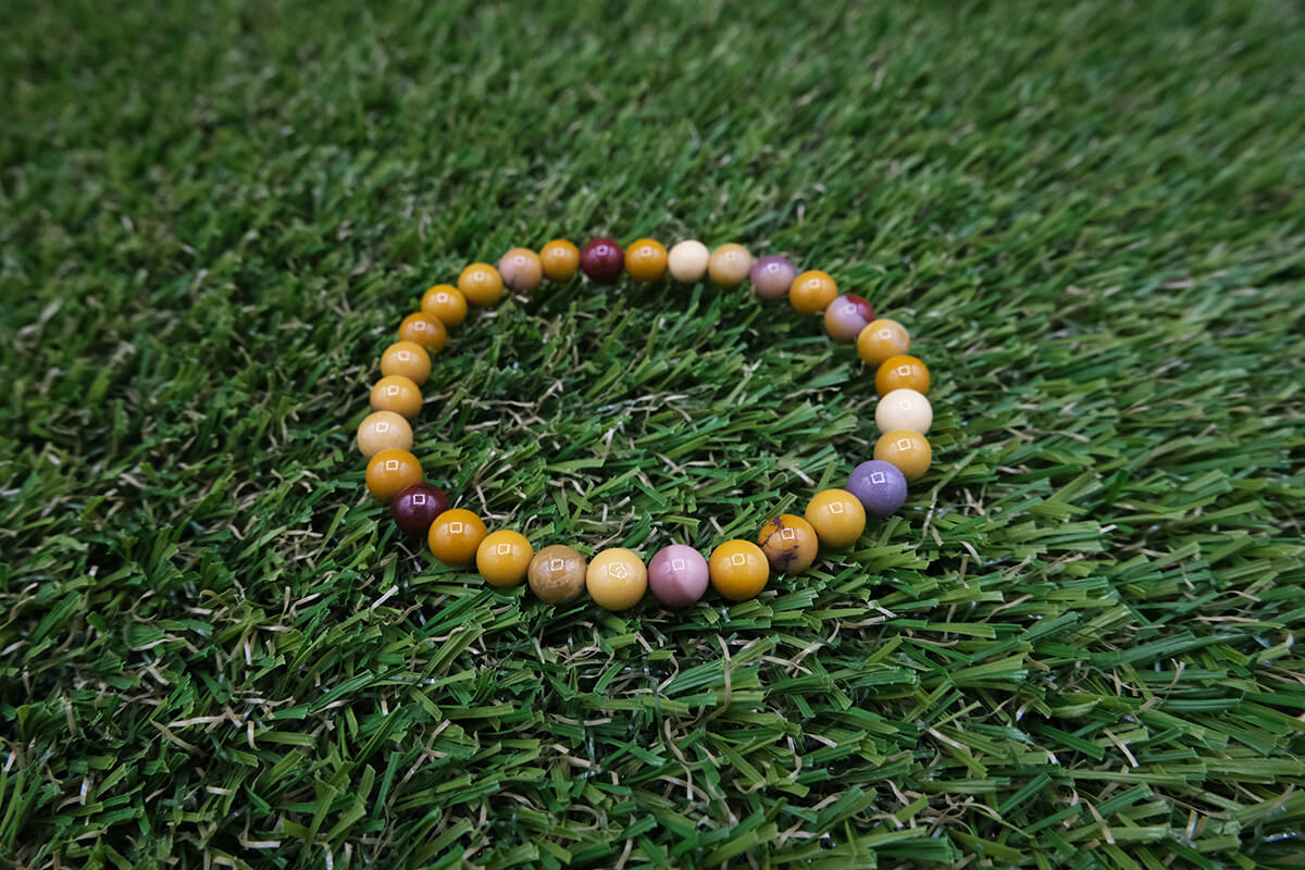 Náramek z Jaspisu navlečený na pružné, transparentní gumičce.