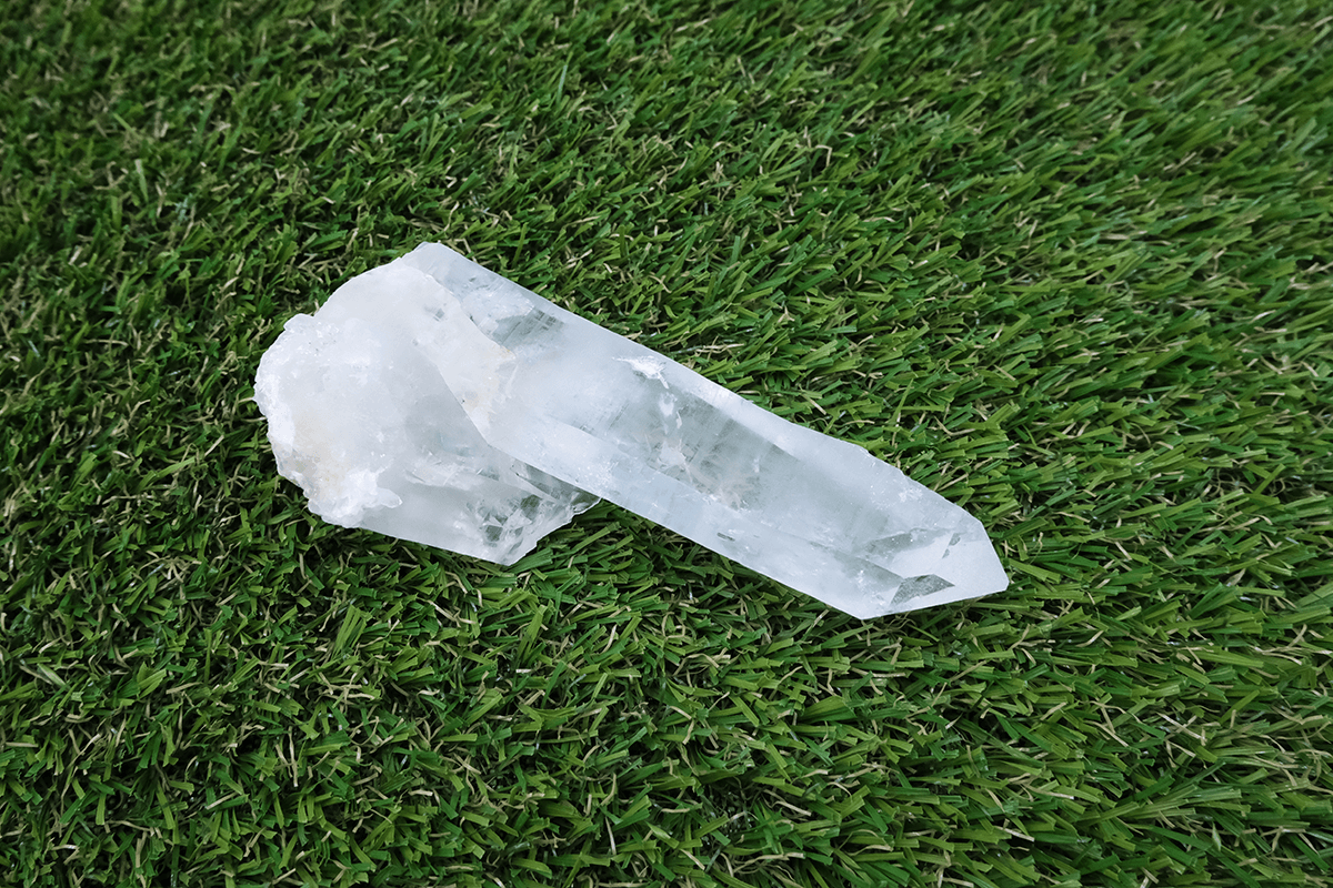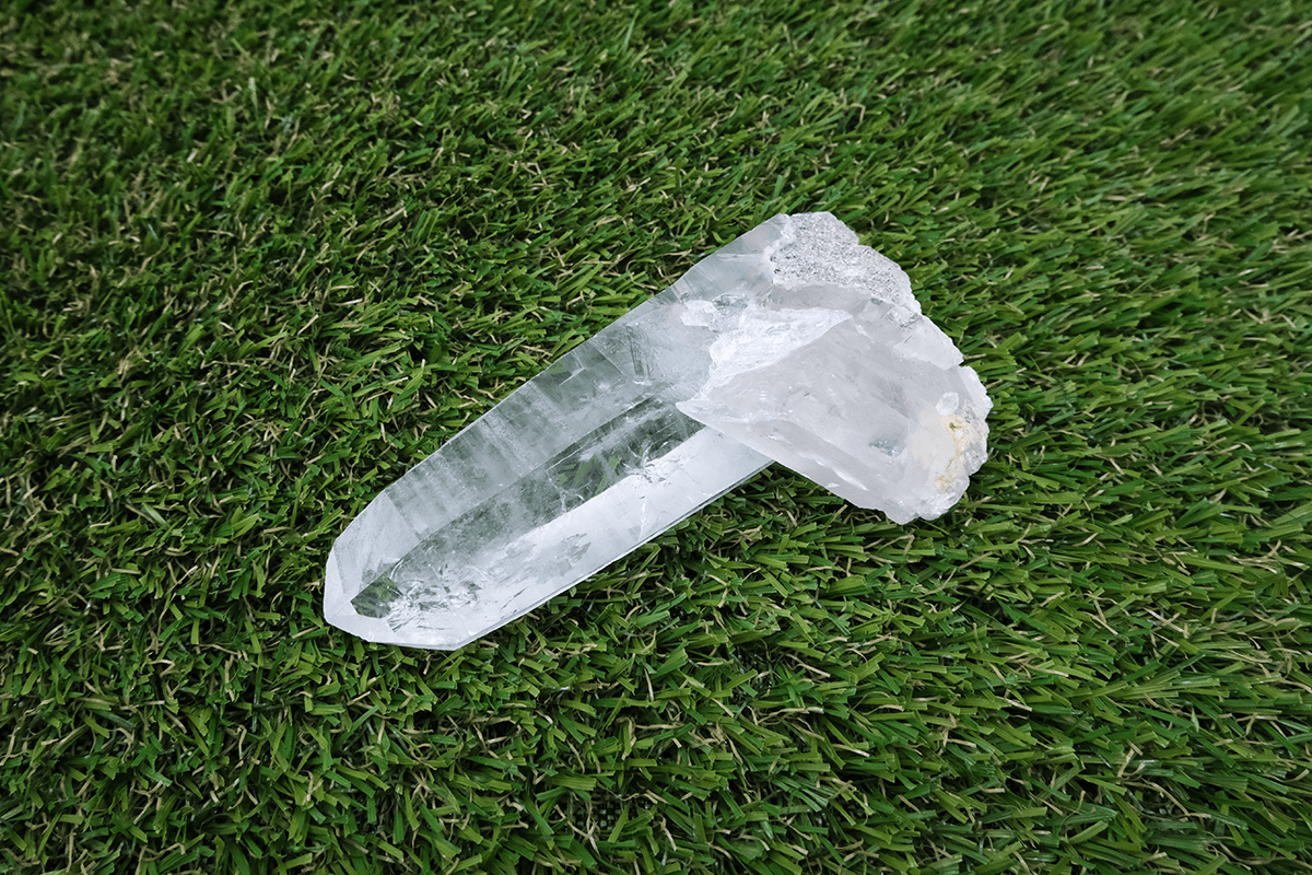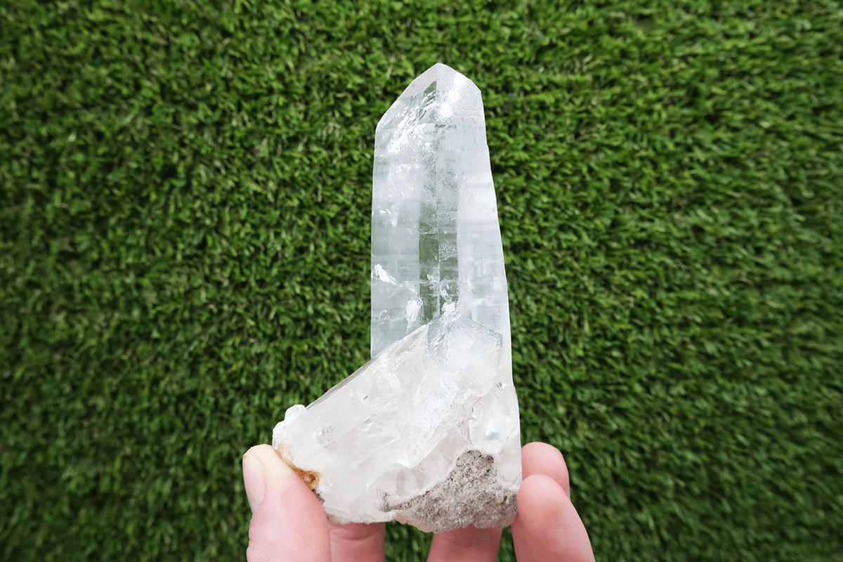 Čistý krystal křišťálu s horizontálními pruhy. Krystal má nepatrný defekt hrotu viz. foto.