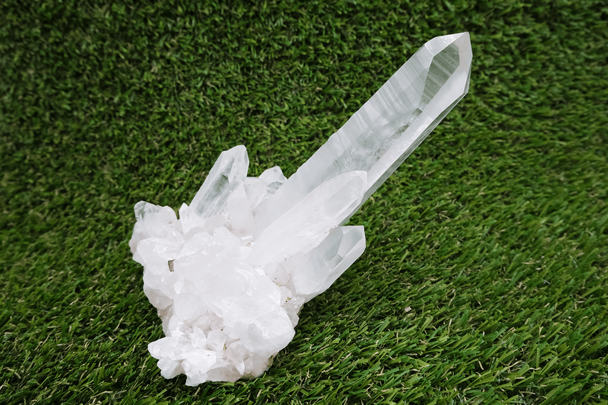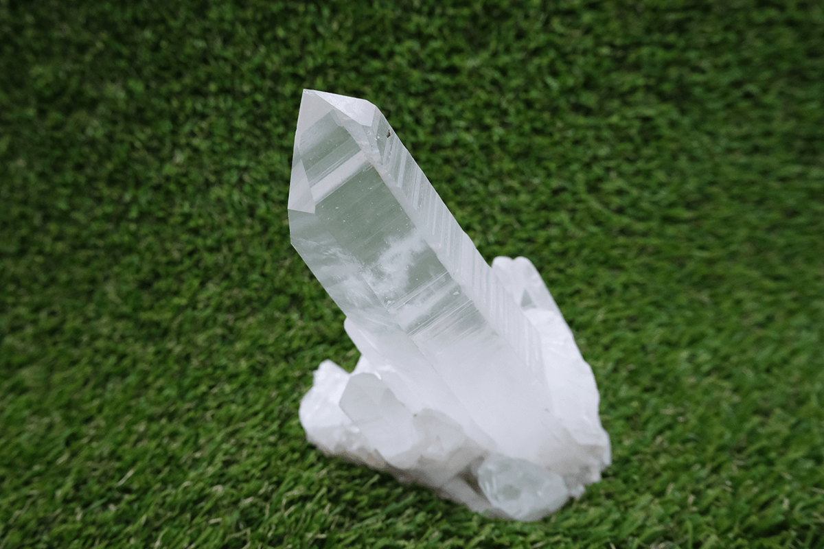 Křišťálová drúza s hlavním krystalem s horizontálními pruhy. Hlavní krystal má nepatrný defekt hrotu viz foto.