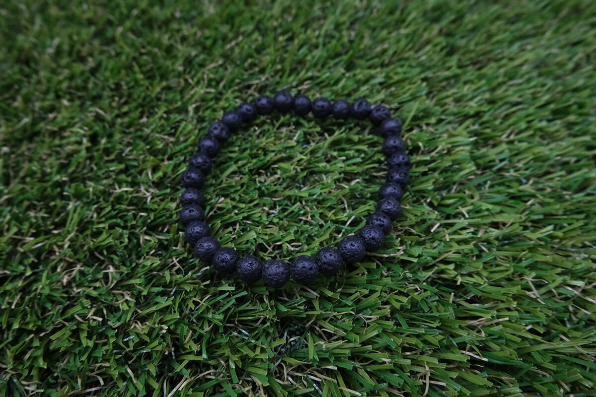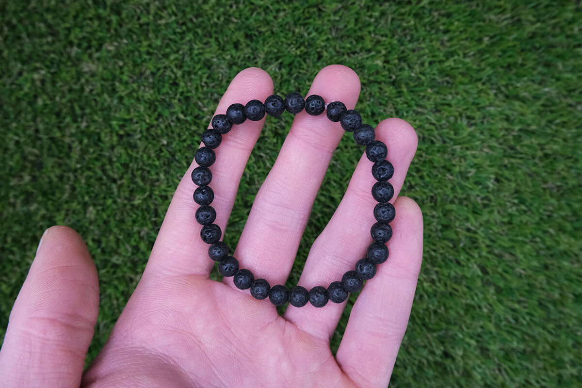 Náramek z Lávy navlečený na pružné, transparentní gumičce.