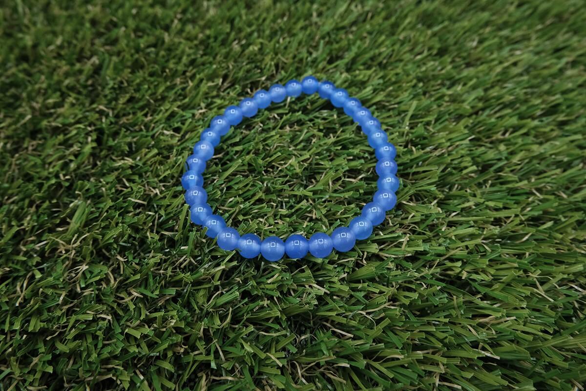 Náramek z modrého chalcedonu navlečený na pružné, transparentní gumičce.