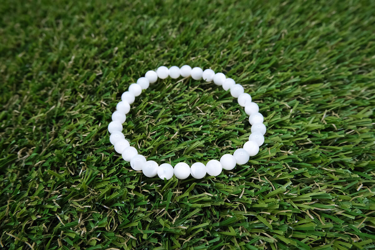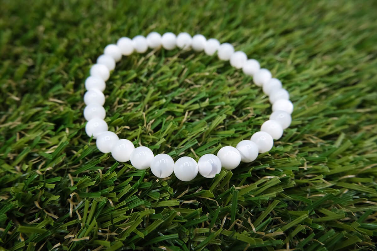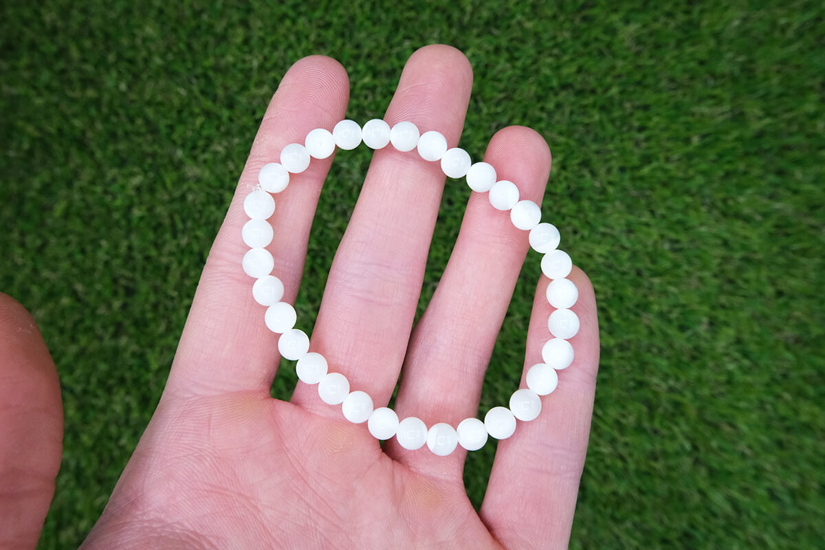 Náramek z Mušle navlečený na pružné, transparentní gumičce.