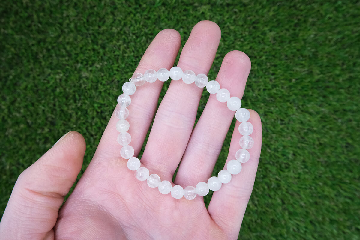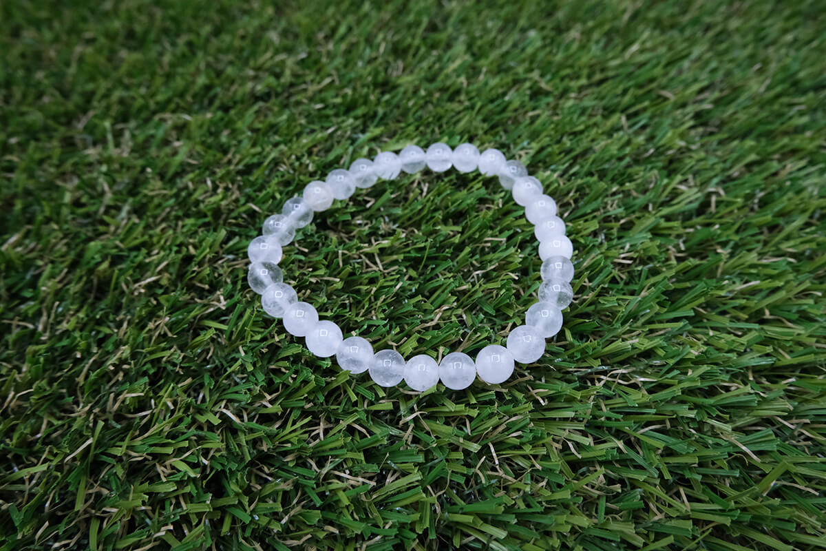 Náramek z křišťálu navlečený na pružné, transparentní gumičce.