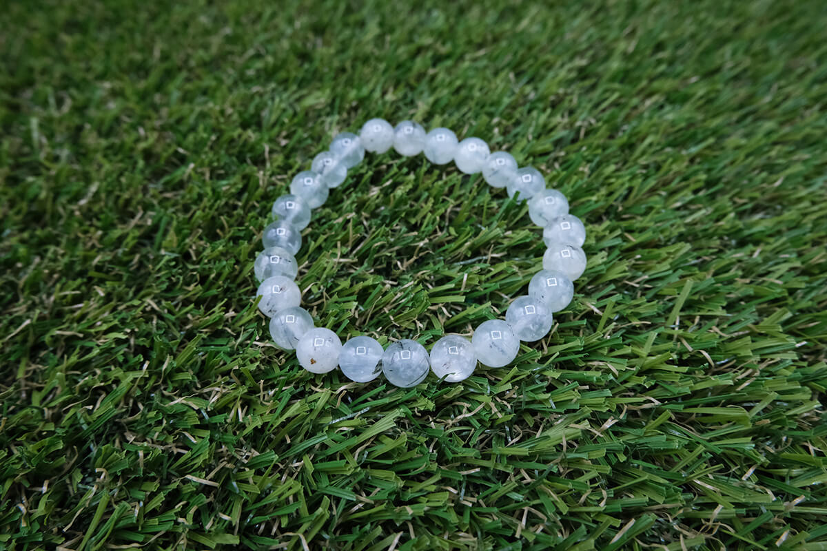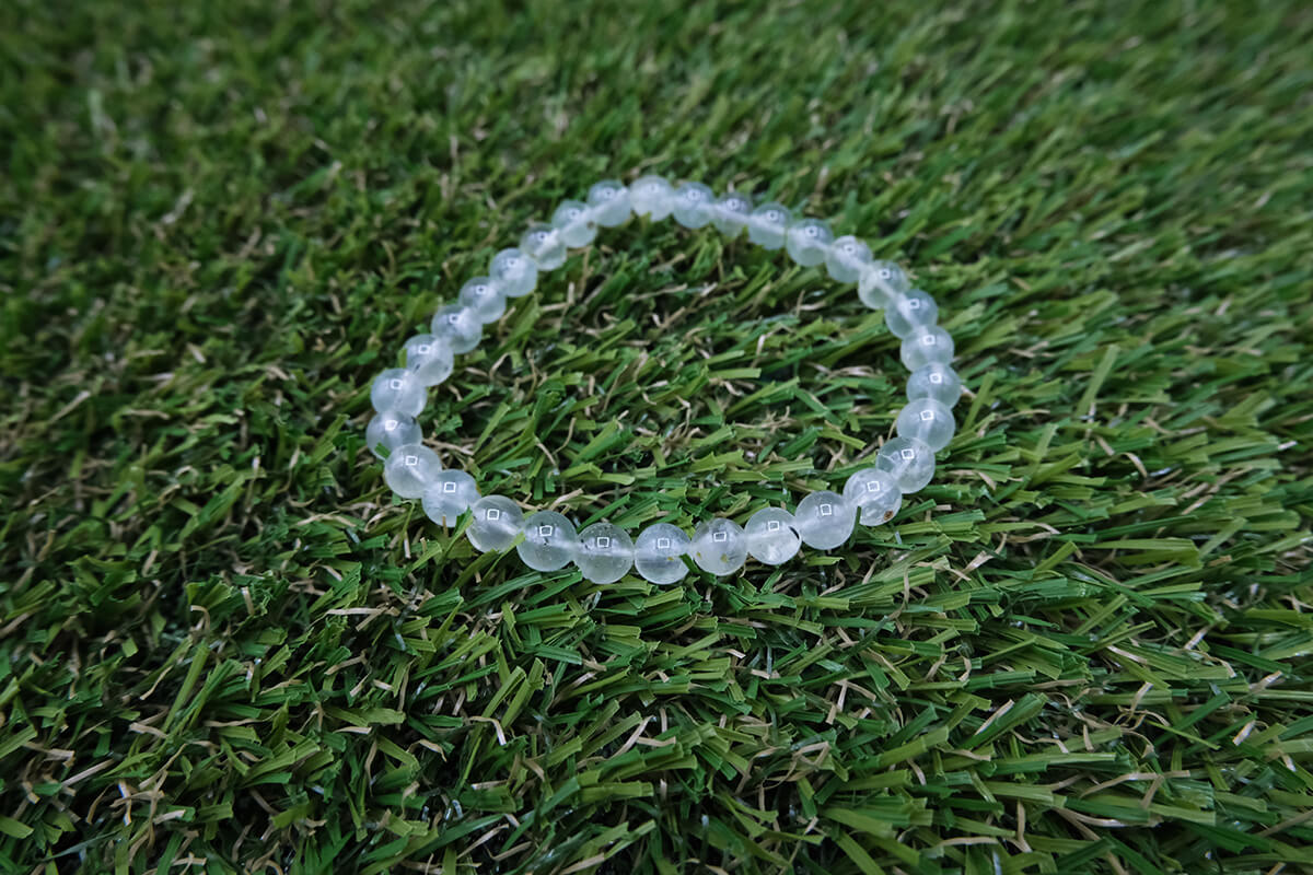 Náramek z prehnitu navlečený na pružné, transparentní gumičce.