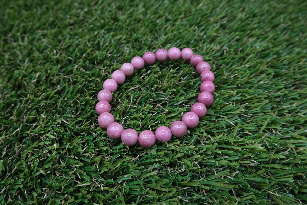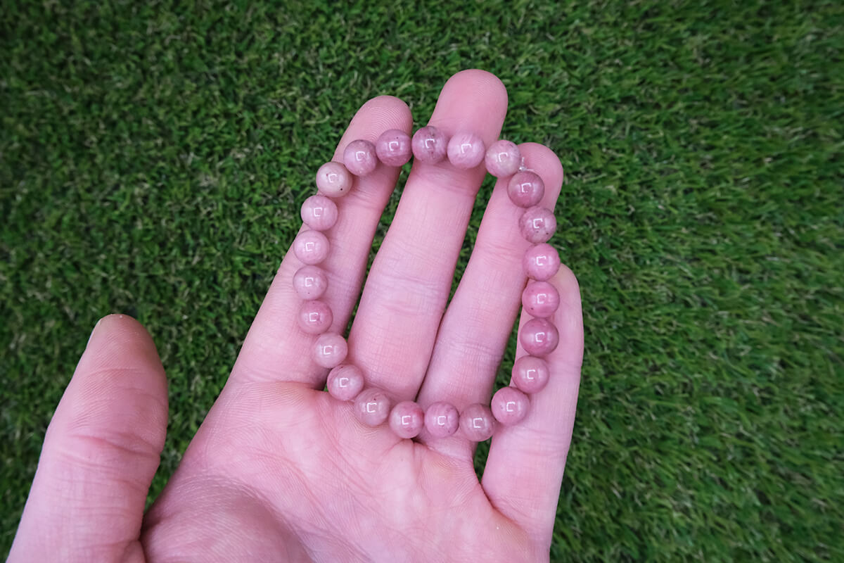 Náramek z Rodonitu navlečený na pružné, transparentní gumičce.