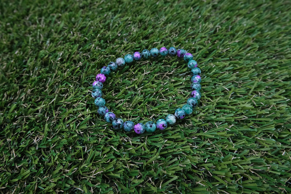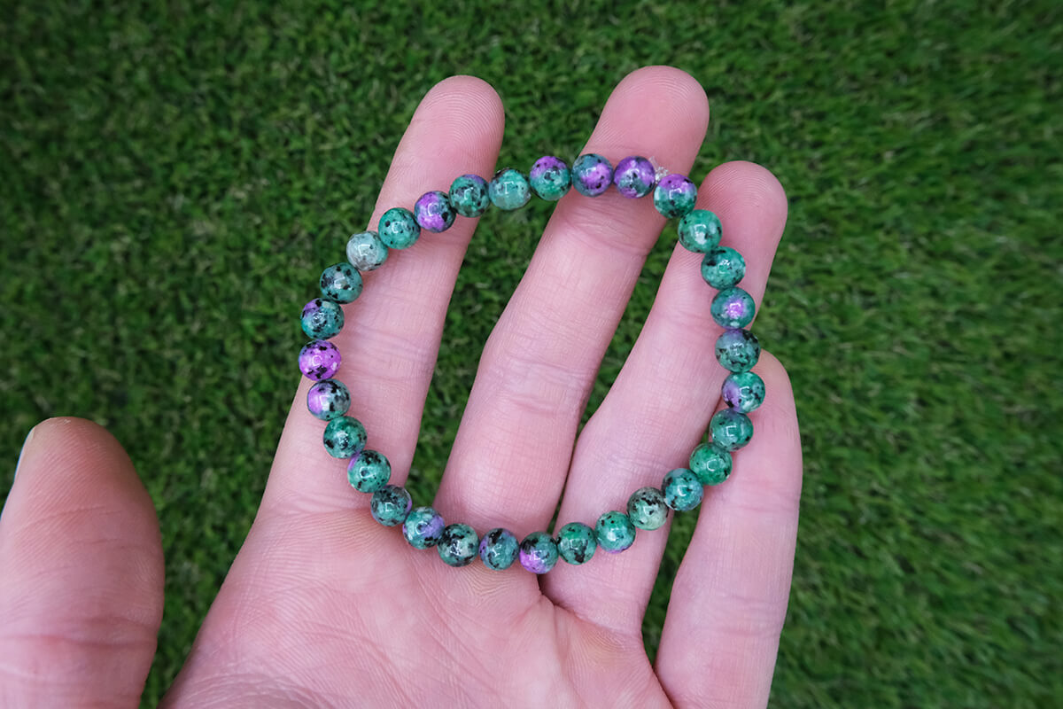Náramek ze Zoisitu s inkluzí rubínu navlečený na pružné, transparentní gumičce.