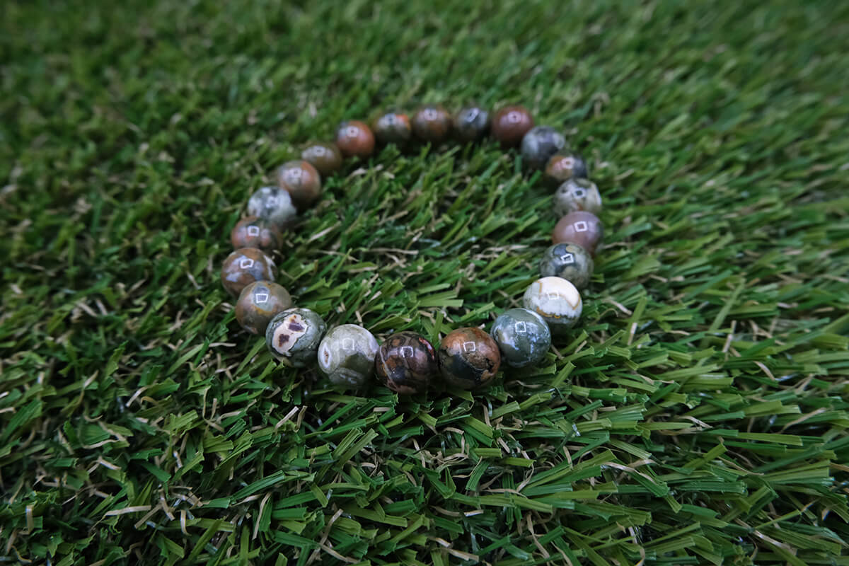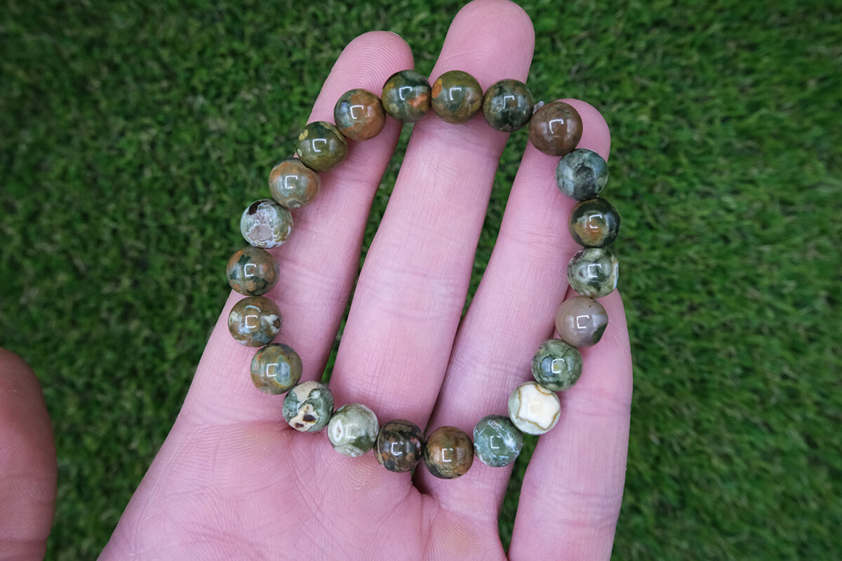Náramek z Ryolitu navlečený na pružné, transparentní gumičce.