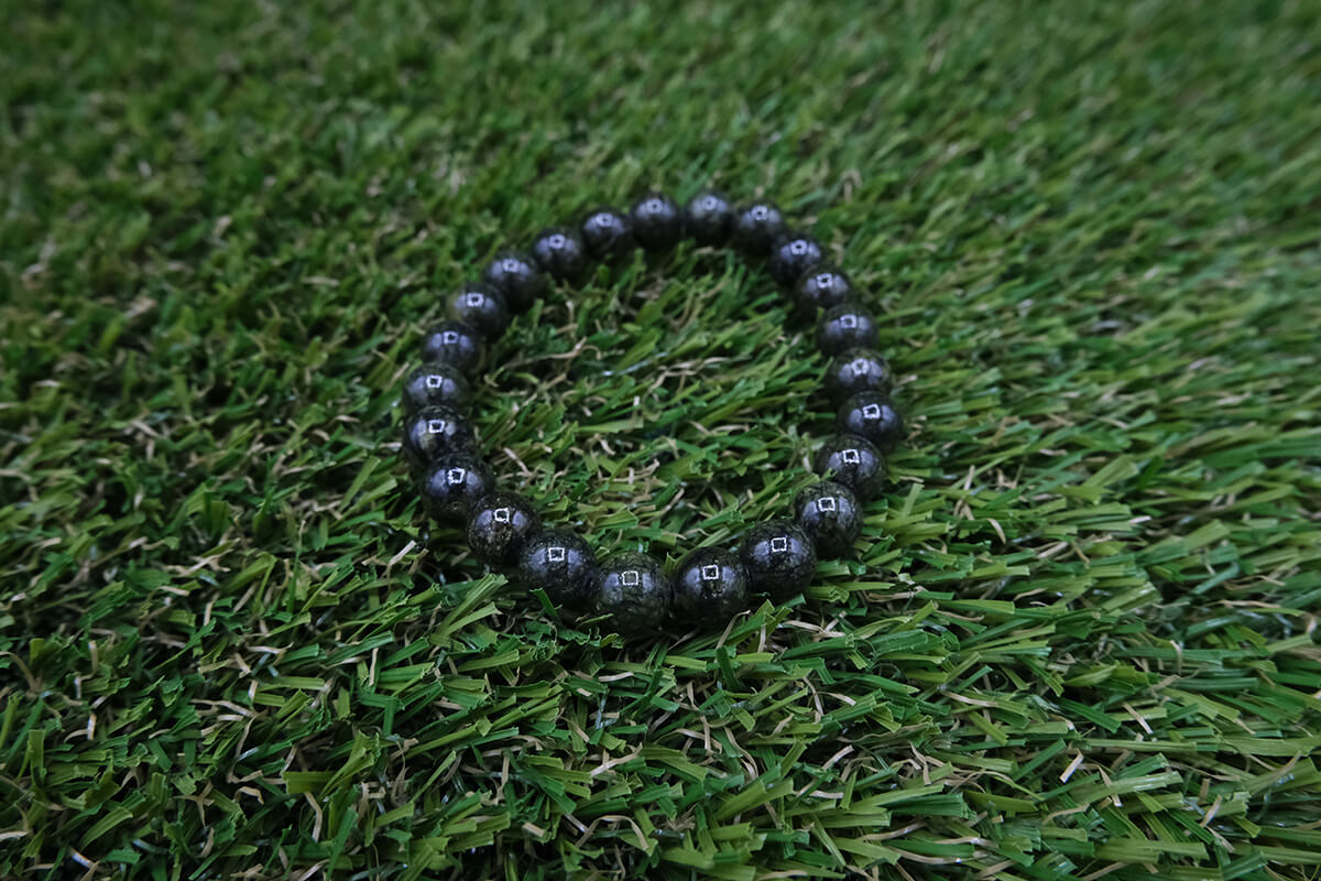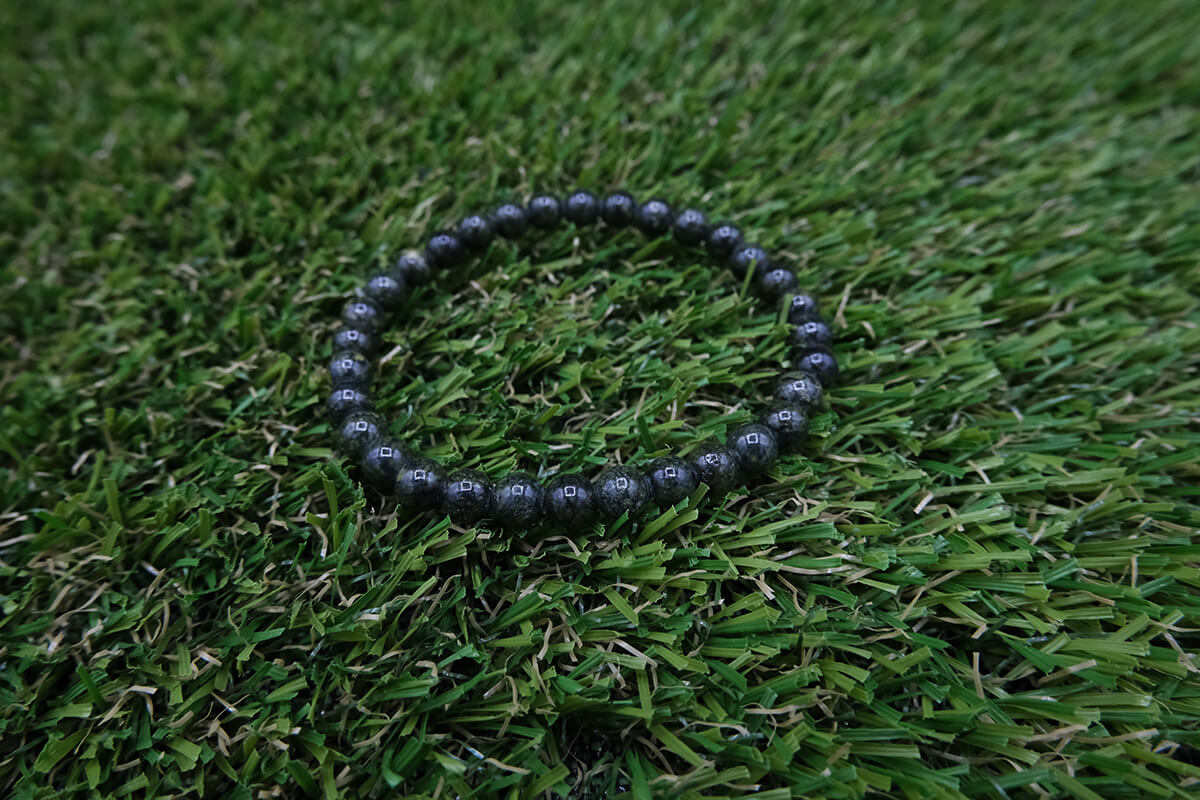 Náramek ze Serpentinitu navlečený na pružné, transparentní gumičce.