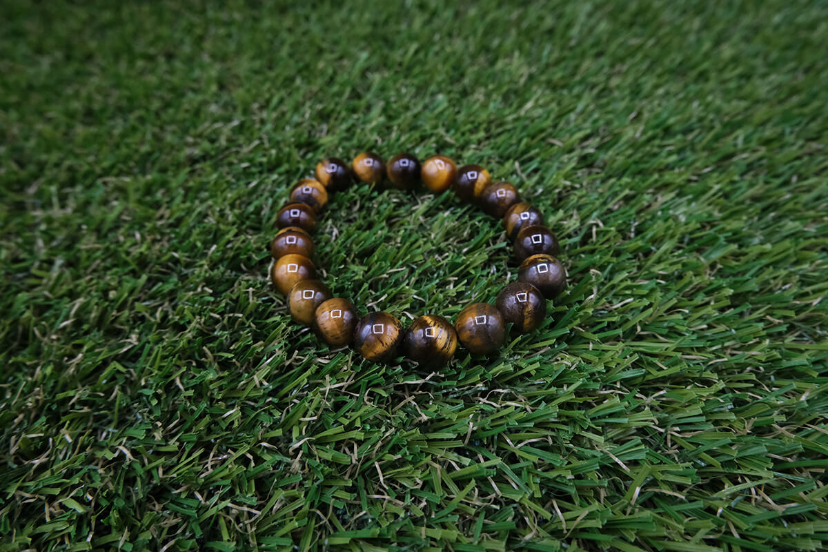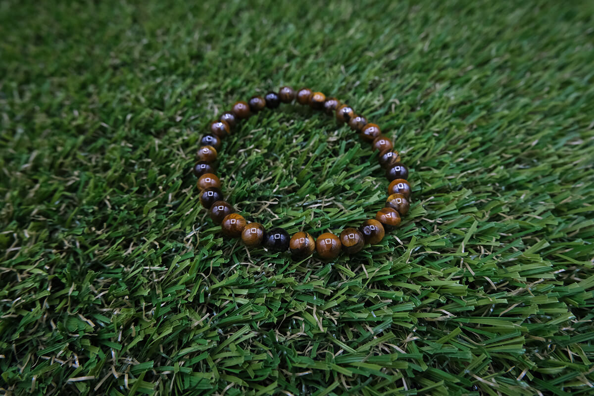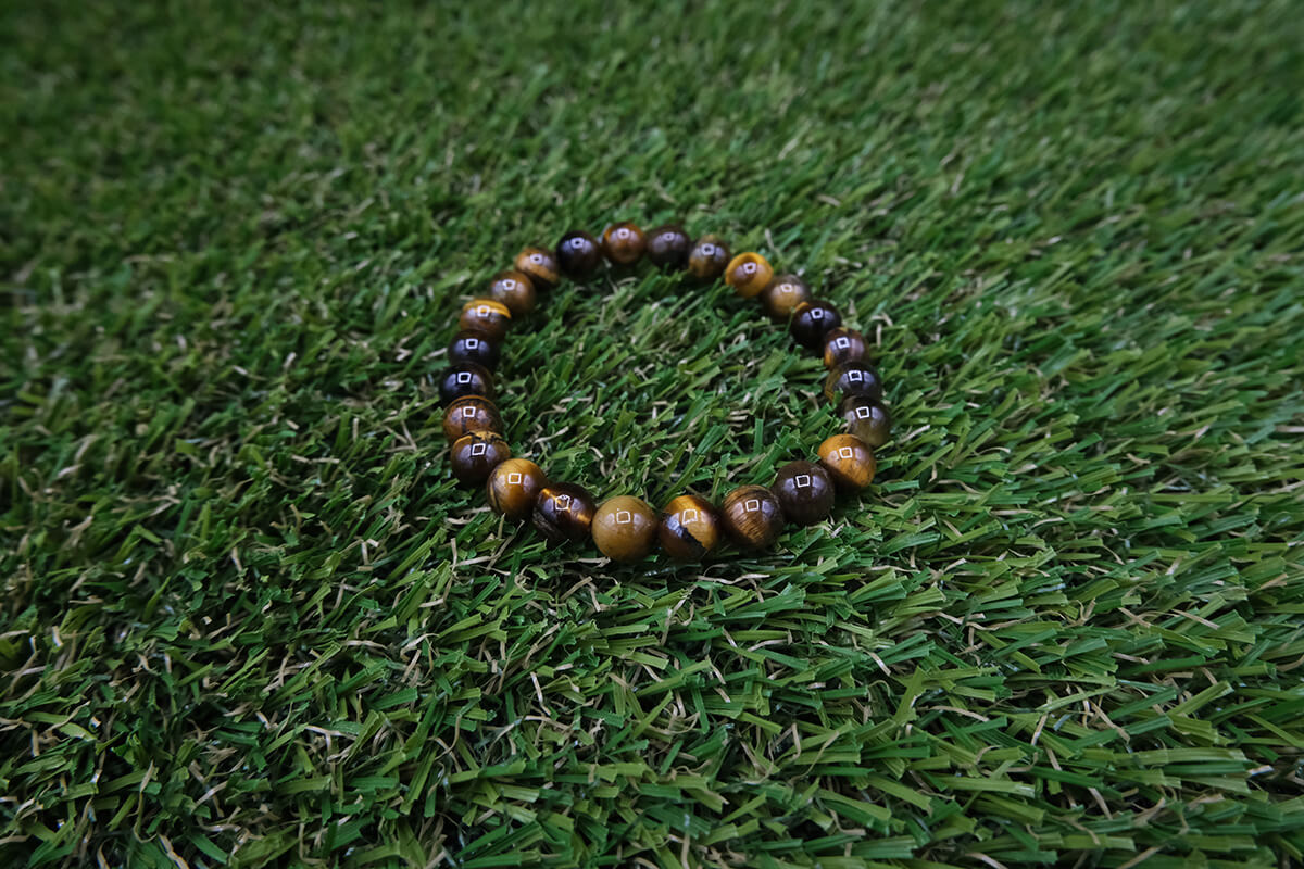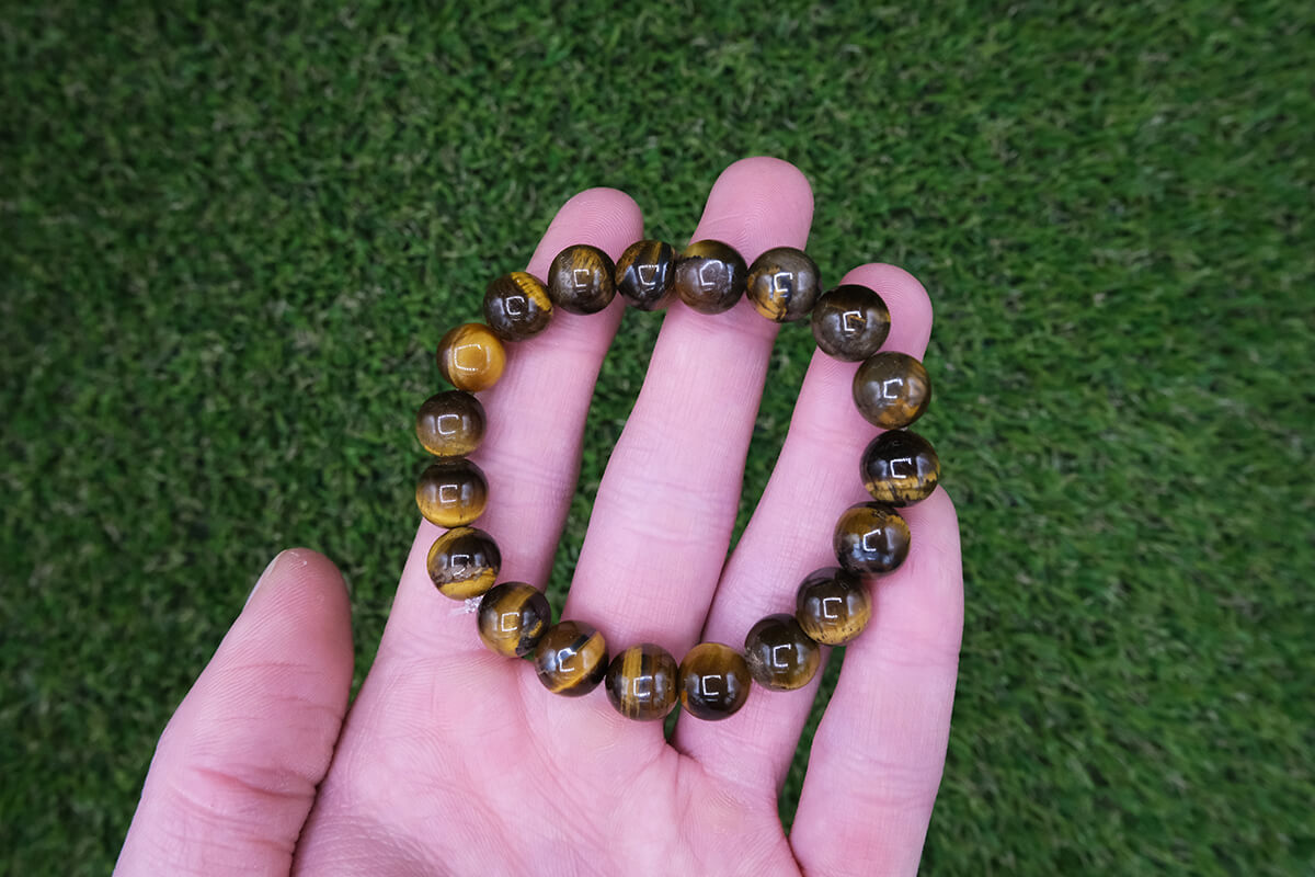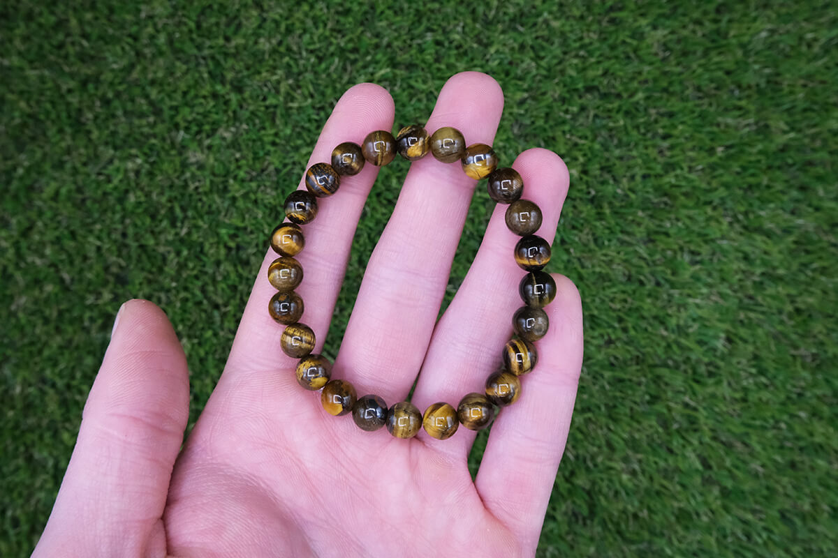Náramek z tygřího oka navlečený na pružné, transparentní gumičce.
